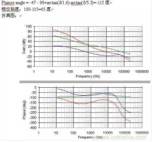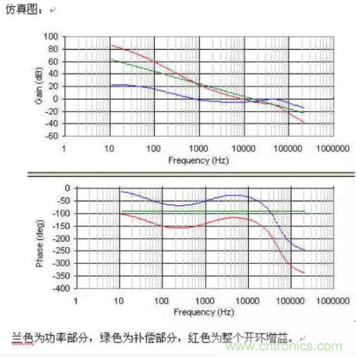 蘭色為功率部分,綠色為補償部分,紅色為整個開環增益.