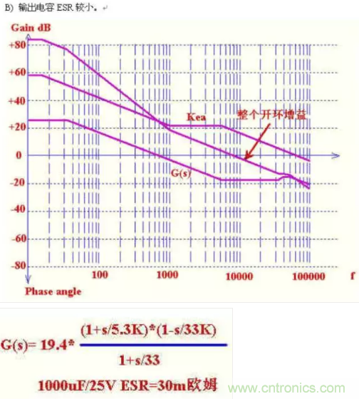 輸出濾波電容的內阻比較大,自身阻容形成的零點比較低,這樣在8K處的相位滯后比較小.Phanseangle=arctan(8/1.225)-arctan(8/0.033)-arctan(8/33)=--22度.
