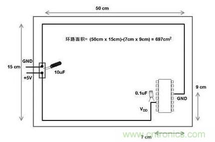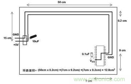 電源線(xiàn)和地線(xiàn)配合不當(dāng)?shù)腜CB設(shè)計(jì)示例如圖2所示,此電路板上,設(shè)計(jì)出的環(huán)路面積為697cm²。采用圖3所示的方法,電路板上或電路板外的輻射噪聲在環(huán)路中感應(yīng)電壓的可能性可大為降低。