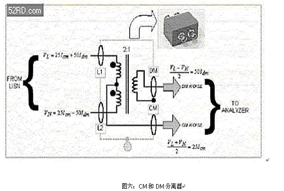 圖六是一種以變壓器為基礎的裝置,它是利用共模電壓無法使變壓器工作的原理;因為本質上需要差動的一次測電壓,才能使變壓器線圈內的磁通量“擺動(swing)”。它不像LISN MATE,此時CM和DM雜訊是一起輸出。不過,上述的兩種方法都需要修改LISN電路。因為一般的LISN只提供VL或VN,無法同時提供這兩者。最好是購買CM和DM雜訊有分離輸出的LISN。此外,也應該要有總和檢視的功能,以確定是否有遵守技術規范的限制。