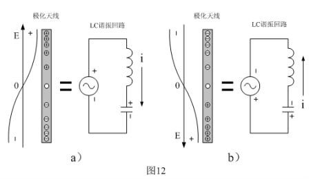圖12是極化天線的工作原理圖,圖12-a)和圖12-b)表示天線在電場(chǎng)中被感應(yīng)產(chǎn)生極化的兩種不同情形。所謂極化就是導(dǎo)體或物體在電場(chǎng)力的作用下產(chǎn)生帶電,這種帶電是極化帶電,即:導(dǎo)體或物體的一端帶正電,而另一端帶負(fù)電。一般地說(shuō),導(dǎo)體或物體被極化帶電,只是兩端帶電,而中心點(diǎn)是不帶電的。由于,極化天線的電場(chǎng)是一個(gè)交變電場(chǎng),所以,天線總是在圖12-a)和圖12-b)之間來(lái)回變化。12-a)和圖12-b)最左邊的圖形是表示電場(chǎng)方向和天線的電荷分布曲線,中間圖形表示載流子在極化天線中流動(dòng),右邊圖形表示天線的等效電路。