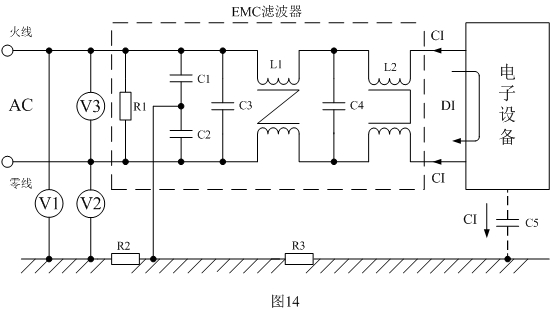 圖14是根據上面分析而設計的EMC(電磁兼容)濾波電路,EMC濾波電路如虛線框內所示。