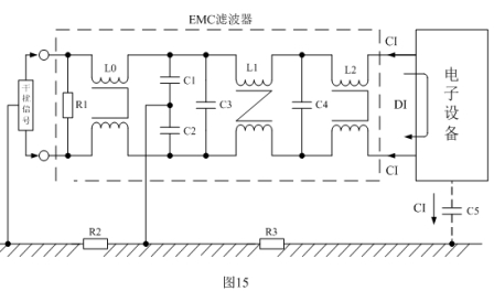 圖15與圖14相比,多了一個L0低通電感濾波器,目的是為了提高對外來傳導干擾信號的抑制能力。如果只考慮提高抑制本電子設備干擾的能力,可把C1、C2的連接位置移放到電源線的最前端,即:盡量靠近測試儀表的接入處,抑制干擾效果會更顯著。需要檢查電子設備對外來電磁干擾信號的抑制能力,可在電源線輸入端輸入一個干擾信號,然后檢測電子設備被干擾影響的程度,如:電視機出現行掃描不同步等。對不同的電子設備,干擾信號也有不同的要求,這些標準制定一般都是由行業協會提出,最后由標準制定單位推薦使用。