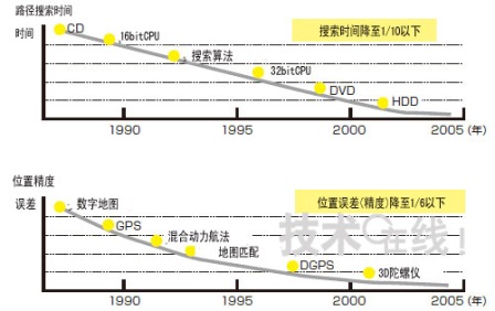 為了實現上述進步,車載導航儀的性能得到了穩步提高。以路徑搜索時間為例,2007年與1990年相比,時間縮短到了1/10以下。位置誤差(精度)實現了1/6以下的高精度化(圖3)。