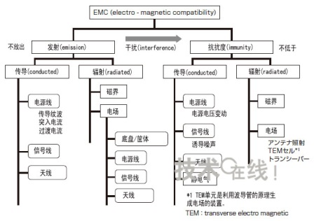 圖6給出的樹形圖對于理解EMC的整體結構很有幫助,本公司的內部培訓也經常使用。這是按照發射/抗擾度、傳導/輻射的組合,把EMC分成四個大類進行整理的方法。其中,在設計階段的EMC研究和測量精度方面,尤其需要注意的是電場的輻射。