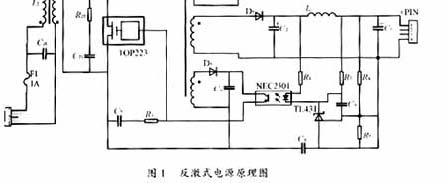 輸入為交流85~200V,經功率二極管整流橋變為直流,作為DC/DC反激變換器的輸入,輸出為三組直流:5V、15V、20V,另外還有一輔助電源5V,用來給光耦NEC2501供電??刂齐娐窞榉答伩刂?,開關選用TOPSwitch電源芯片(TOP223)。TOPSwitch為三端離線式PWM電源集成控制器,它將PWM控制器與功率開關MOSFET合為一體,采用TO-220或8腳DIP封裝,除D、C2腳外,其余6腳連在一起作為S端。