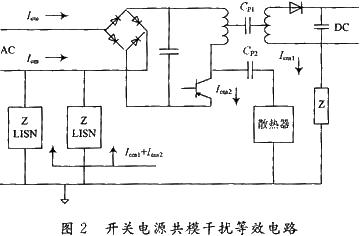 如圖2所示,當開關管轉為“關”時,集電極與發射極間的電壓快速上升達500V,他產生的電流經集電極與地之間的分布電容返回整流橋,這個按開關頻率工作的脈沖串電流是共模噪聲。這個電壓會引起共模電流Icm2向CP2充電和共模電流Icm1向CP1充電,其中CP1為變壓器初、次級之間的分布電容,CP2為開關電源與散熱器之間的分布電容(即開關管集電極與地之間的分布電容)。則線路中共模電流總大小為Icm1+Icm2。