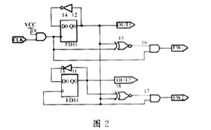 分頻電路可根據各具體干擾源的脈沖寬度來確定。具體電路如圖2所示,CLK為8M晶振信號,經整形后作為DQ觸發器的觸發信號,OUT1輸出二分頻后的4M方波信號,同時作為下一級觸發器的時鐘信號OUT2輸出四分頻后的2M方波信號,FW1輸出頻率為4M、脈寬為125ns的脈沖信號,FW2輸出頻率為2M、脈寬為250ns的脈沖信號,具體波形如圖3所示。由此類推,繼續級連DQ觸發器即可輸出八分頻、十六分頻信號,脈寬也可視具體情況而作相應的改變,電路類似FW1、FW2的產生電路。