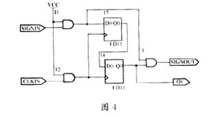 根據干擾源的情況,以前面所述信號作為觸發時鐘,未經處理的信號源經觸發產生延時,再與其本身相比,這樣,一些干擾信號由于脈寬過窄而被濾去。具體電路如圖4所示。