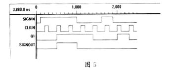 SIGNIN為需處理的信號,被第一個觸發器觸發后,產生延時,同時送入二級觸發器產生二級延時。CLKIN信號的頻率可視干擾源的寬度而定,但需注意的是,干擾源的寬度要遠遠小于信號源的寬度,否則信號寬度將被大幅削減,導致特性被破壞。電路仿真波形如圖5所示。