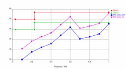 對于電子產品的電磁輻射,國際電工委(IEC:InternationalElectrotechnicalCommission)制定了強制標準。通常,印制板都只是系統中的一部分,在進行電磁輻射分析的時候除了要考慮印制板本身的輻射問題外,還需要考慮系統中其它設備對對電磁輻射的影響,尤其是帶有通風孔機箱的屏蔽效能。CST印制板工作室在進行SI仿真的同時,可以得到印制板上電流分布的幅度和相位信息,并通過與CST微波工作室的協同將該電流分布作為激勵源,然后再加上機箱,充分考慮孔、縫對電磁輻射的影響。仿真的結果自動與內嵌的EMC國際標準限值進行對比,如圖16所示。