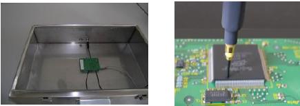 表面掃描法通過測量集成電路表面電場和磁場的方法來描述集成電路的電磁發射特性。該方法的測量頻率范圍可達10MHz—3GHz,測量采用電場探頭或磁場探頭按一定順序掃過集成電路表面,由接收機將相應的測量結果依次傳送給計算機處理。測試結果的準確性與電場或磁場探頭的特性和探頭定位裝置的精度有關。該方法可用于探測集成電路芯片上不同部位的電磁發射分布情況,適用于對集成電路的不同設計方案的電磁發射特性的比較。