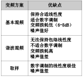 表1列舉了3種主要的下變頻技術(shù),同時指出了各自優(yōu)缺點(diǎn)?;净祛l似乎是最佳方案。在4.6GHz~6GHz下變頻場合,使用固定頻率的本振,1.1GHz輸出信號的頻帶與輸入信號頻帶相同,因此稱為區(qū)變頻。