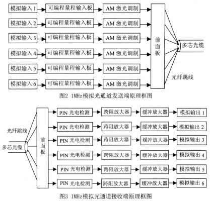 EMC測試低頻光導傳輸設備1MHz模擬光通道包含6個低頻模擬信號光傳輸通道,6個低頻傳輸通道的信號頻帶為100Hz~1MHz,采用1550nm單縱模DFB激光器和AM直接強度調(diào)制技術(shù),通過6芯單模光纖傳輸,原理框圖如圖2、圖3所示。