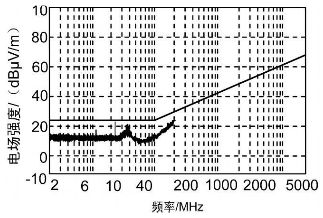對RE102 試驗項目進行觀察,發現測試結果圖的超標點為24 MHz、36 MHz 兩點,而這兩點分別是12 MHz 頻率點的二三次諧波。為了找到這一頻率點的元器件,對機箱內各單元進行了分析,發現控制保護單元中有一個12MHz 晶振,由于晶振屬于高噪聲元器件,能夠產生較強的輻射,從而使其周邊充滿著近場輻射場。如果輻射場內有器件或走線,晶振及其諧波信號將耦合到器件或走線上而輻射出去;再者又發現控制保護單元的PCB 板未采取就近接地措施,只是通過一根長引線和機殼地相連,造成信號的環路面積增大,產生了很強的輻射,所以對控制保護單元采取措施應該是行之有效的。首先對晶振進行屏蔽且屏蔽體就近接地,弱化輻射發射強度; 然后控制保護單元的PCB 板同樣采取就近接地措施,并且在屏蔽盒出口處的信號線上安裝一個鐵氧體磁環,可以將不需要的高頻干擾抑制掉。通過采取以上措施后,RE102 試驗指標合格,如圖3 所示。