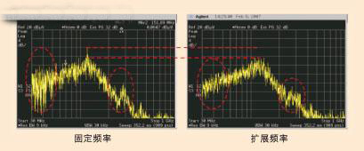 從圖中可見(jiàn),在處理D類(lèi)固有的周期性方波時(shí),最基本的難題是諧振間隔時(shí)出現(xiàn)的集中能量。為了設(shè)計(jì)一個(gè)“安靜”的低EMI D類(lèi)放大器,一個(gè)方法是將頻率來(lái)回抖動(dòng),或擴(kuò)展開(kāi)關(guān)的頻譜,降低頻譜內(nèi)所有點(diǎn)上的能量。與傳統(tǒng)的D類(lèi)放大器相比,擴(kuò)頻調(diào)制方案有幾個(gè)重要的優(yōu)點(diǎn):除了可保持高效效率和低THD+N外,更重要的是大幅削減了輻射噪聲和EMI,如圖6中所示。