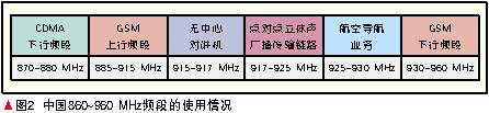 圖2顯示了中 國在860~960 MHz頻段的頻率使用現(xiàn)狀,920~925 MHz的RFID頻段實際上是立體聲廣播點(diǎn)對點(diǎn)傳輸業(yè)務(wù)頻段分出5 MHz與RFID共用,與GSM上/下行頻段只有5 MHz的頻率間隔,與無中心對講機(jī)系統(tǒng)只有3 MHz的頻率間隔。