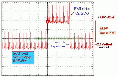圖 1 1.5 英尺以外的發射器(f = 470 MHz, P= 0.5W)開啟和關閉時 ECG 診斷設備的心臟檢查結果
