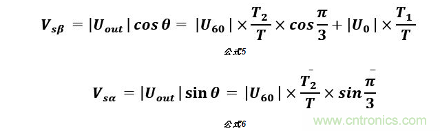 由8個基本電壓空間矢量可以合成任意定子電壓矢量。如圖4所示,以U0, U60扇區為例,若在一個PWM周期T內,同時輸出T1時間U0矢量和T2時間的U60矢量,則由矢量(T1/T)U0,(T2/T)U60可以合成給定的參考電壓矢量Uout。