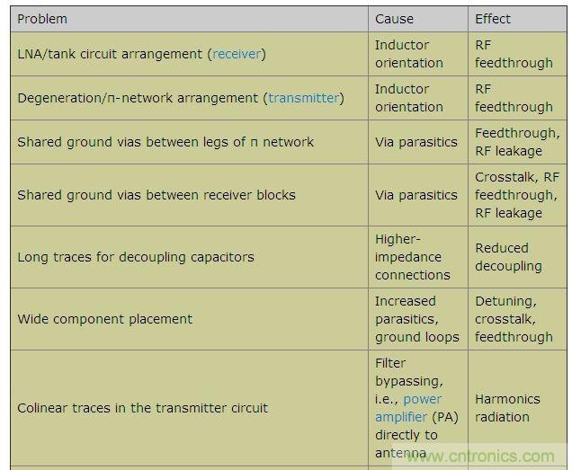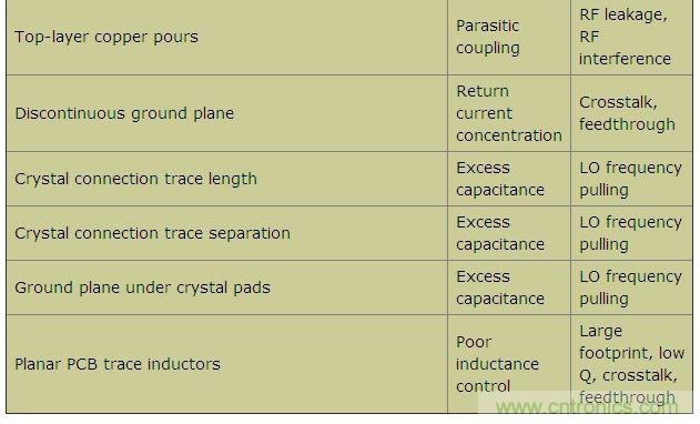本文羅列了各種不同的設計疏忽,探討了每種失誤導致電路故障的原因,并給出了如何避免這些設計缺陷的建議。本文以FR-4電介質、厚度0.0625in的雙層PCB為例,電路板底層接地。工作頻率介于315MHz到915MHz之間的不同頻段,Tx和Rx功率介于-120dBm至+13dBm之間。表1列出了一些可能出現的PCB布局問題、原因及其影響。