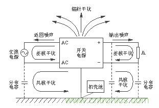 開關電源的電磁噪聲從噪聲源來說可以分為兩大類。一類是外部噪聲,例如,通過電網傳輸過來的共模和差模噪聲、外部電磁輻射對開關電源控制電路的干擾等。另一類是開關電源自身產生的電磁噪聲,如開關管和整流管的電流尖峰產生的諧波及電磁輻射干擾。