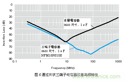 圖6中對片狀三端子電容器與片狀二端子多層電容器的插入損耗特性進(jìn)行了比較。兩種元件的靜電容量相同,因此在低頻范圍內(nèi)特性相同。但是二端子電容 器在頻率超過10MHz后性能便開始下降,而三端子電容器則在超過100MHz后才會出現(xiàn)性能下降。由于片狀三端子電容器在一定程度的高頻范圍內(nèi)都不會出 現(xiàn)性能下降,因此它適用于需要去除高頻干擾的情況。