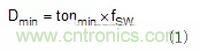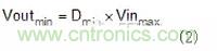 試圖在2MHz條件下工作時(shí)的第二個(gè)考慮因素是最小輸入電壓(VIN)和輸出電壓(VOUT)的轉(zhuǎn)換比。這與轉(zhuǎn)換器的最小接通時(shí)間有關(guān),因?yàn)樵摫嚷试谵D(zhuǎn)換器需要操作時(shí)設(shè)定接通時(shí)間。例如,若轉(zhuǎn)換器具有100ns的最小導(dǎo)通時(shí)間且在2MHz條件下工作,則使用公式1,其可以支持的最小轉(zhuǎn)換比(Dmin)為20%。若給定的VIN至VOUT比所需的導(dǎo)通時(shí)間小于最小導(dǎo)通時(shí)間,則多數(shù)轉(zhuǎn)換器進(jìn)入脈沖跨越模式以保持輸出電壓穩(wěn)定。當(dāng)脈沖跨越時(shí),開關(guān)頻率發(fā)生變化且可能在需要限制噪聲的頻率中引起噪聲。
