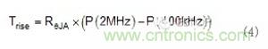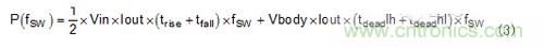 與開關(guān)頻率相關(guān)的轉(zhuǎn)換器中的兩個(gè)主要損耗是高側(cè)MOSFET和死區(qū)時(shí)間損耗的開關(guān)損耗。等式3是這些損失的基本估計(jì),您可用它進(jìn)一步分析伴隨較高開關(guān)頻率損耗增加的影響。例如,若為5V輸入、4A負(fù)載、3ns上升時(shí)間、2ns下降時(shí)間、0.7V體二極管壓降和20ns死區(qū)時(shí)間,預(yù)估功率損耗在2MHz時(shí)為325mW,在400kHz時(shí)為65mW。