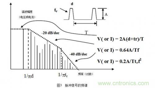在EMC中,除了基本頻率外,還需考慮諧波因素,通常取十倍頻,但在數字電路中卻有些不同,比如在時鐘電路和邏輯門電路中,輻射帶寬與數字信號的上升沿或下降沿有關系,而不是數字信號的重復周期,其關系為:rtF?/1max?,其中rt是脈沖的上升沿時間。例如,典型時鐘驅動的邊沿速率是2ns,此時,maxF≈160MHz,再考慮十倍頻,則此時鐘電路可能產生直到1.6GHz的輻射帶寬。所以在選擇器件時要選擇慢速的邏輯器件系列,因為器件對電磁輻射貢獻的大小與工作頻率無直接關系而只取決于邊沿速率(這和從電路功能設計上選擇快速器件是矛盾的,在電路設計時需要折中考慮)。還有從器件的抗擾能力上來說,CMOS器件是最好的,因為它的噪聲容限高。從封裝上來說,BGA是最好的,因為它的引線很短。脈沖信號的頻譜如圖3所示。