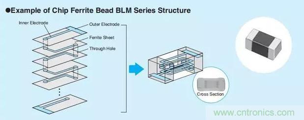 下圖為片狀鐵氧體磁珠的典型結(jié)構(gòu)。在原始鐵氧體片層之間形成線圈圖案,并且通過(guò)集成和燒制的過(guò)程,產(chǎn)生三維線圈結(jié)構(gòu)。