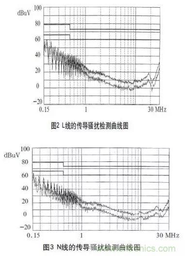 在3m法電波暗室對試驗樣機進行測試,其L、N線的傳導騷擾檢測曲線如圖2、3所示,輻射騷擾的垂直極化掃描曲線如圖4、5所示。