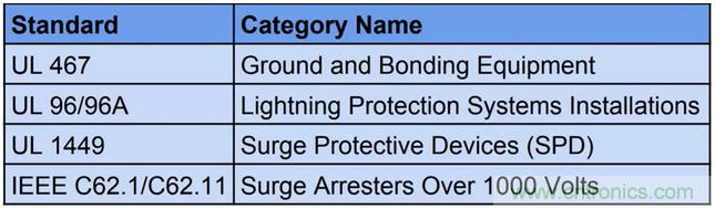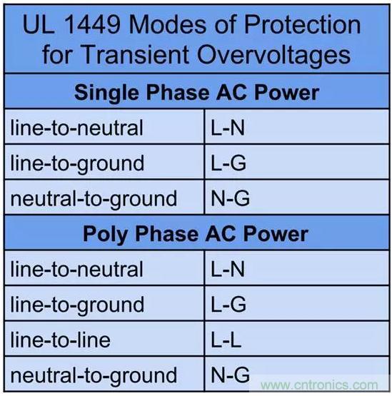 美國保險商實(shí)驗(yàn)室(Underwriter’s Laboratory)所列的數(shù)種避雷防護(hù)標(biāo)準(zhǔn)主要針對浪涌保護(hù)中采用的設(shè)備(見表2)。其中,浪涌保護(hù)器件標(biāo)準(zhǔn)UL1449規(guī)定了瞬態(tài)電壓電氣路徑在各種系統(tǒng)供電方式下所需采取的保護(hù)模式。