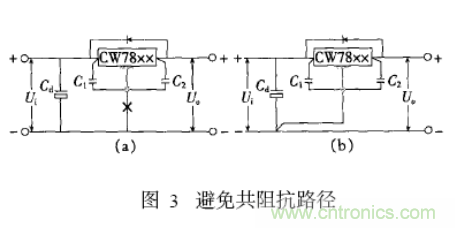 電源線的布置要根據電流的大小盡量加粗走線寬度。在布線工作的最后,用地線將電路板沒有走線的地方鋪滿(大面積) 。在接地時還需要避免共阻抗路徑,如圖8-10所示穩壓器電路的“調整端的取樣點”或“公共點”,千萬不能接在有負載電流流過的輸出線和公共地線上如圖(a)所示,應從管腳’根部’單獨另外用引線引出如圖(b)所示。
