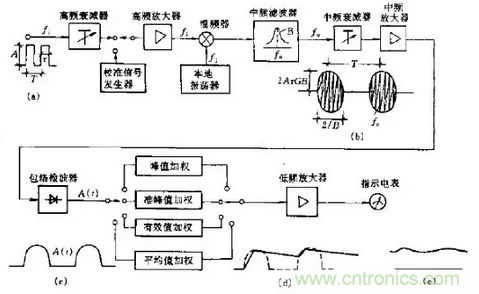 其電路結(jié)構(gòu)類似于半導(dǎo)體收音機(jī)。測(cè)量時(shí)先將測(cè)量?jī)x調(diào)諧,對(duì)準(zhǔn)某個(gè)頻率fi。該頻率經(jīng)高頻衰減器和高頻放大器后進(jìn)人混頻器,與本地振蕩器的頻率fl混頻,產(chǎn)生很多混頻信號(hào)。經(jīng)過(guò)中頻濾波器以后僅得到中頻f0=fl-fi。中頻信號(hào)經(jīng)中頻衰減器、中頻放大器后,由包絡(luò)檢波器進(jìn)行包絡(luò)檢波,濾去中頻得到其低頻包絡(luò)信號(hào)A(t)。A(t)再進(jìn)一步進(jìn)行加權(quán)檢波,加權(quán)可根據(jù)需要獲得A(t)的峰值(Peak)、有效值(rms)、平均值(Ave)或準(zhǔn)峰值(QP),這些值經(jīng)低頻放大后可推動(dòng)電表指示。測(cè)量前如果用校準(zhǔn)信號(hào)發(fā)生器的信號(hào)進(jìn)行預(yù)先校準(zhǔn), 則可以直接讀數(shù)。騷擾信號(hào)的讀數(shù)等效于正弦信號(hào)的有效植。