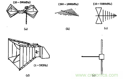 (a) 雙錐天線 (b)對(duì)數(shù)周期天線 (c)混合寬帶天線 (d)喇叭天線 (e)對(duì)稱振子天線