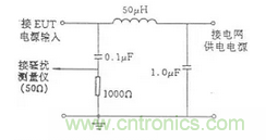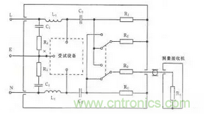 連續(xù)騷擾電壓測量主要測量EUT沿著電源線向電網(wǎng)發(fā)射的騷擾電壓,測量頻率為0.15~30MHz。測量一般在屏蔽室內(nèi)進(jìn)行。測量時(shí)需要在電網(wǎng)和EUT之間插入一個(gè)人工電源網(wǎng)絡(luò)(LISN或AMN),其原理如圖15所示。AMN的作用是隔離電網(wǎng)和EUT,使測到的騷擾電壓
