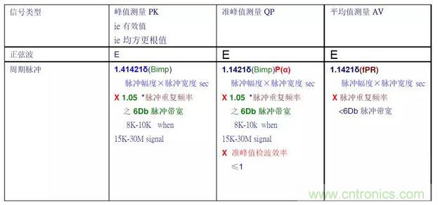 EMI Receiver可以進行準峰值測量、峰值測量和平均值測量。當輸入信號是正弦波時,無論用何種方式測量,得到的讀數都是相同的,等于該正弦波的有效值,精度應優于±2dB。但是如果輸入的是周期脈沖信號,則三種測量方法得到的讀數是不一樣的,其結果如表所示。