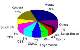 LTCC技術最早由美國開始發展,初期應用于軍用產品,后來歐洲廠商將其引入車用市場,而后再由日本廠商將其應用于資訊產品中。目前,LTCC材料在日本、美國等發達國家已進入產業化、系列化和可進行材料設計的階段。在全球LTCC市場占有率九大廠商之中,日商有Murata,Kyocera,TDK和Taiyo Yuden;美商有CTS,歐洲商有Bosch, CMAC,Epcos及Sorep-Erulec等。國外廠商由于投入已久,在產品質量,專利技術、材料掌控及規格主導權等均占有領先優勢。圖1給出全球LTCC廠商市場占有情況。而國內LTCC產品的開發比國外發達國家至少落后五年,擁有自主知識產權的材料體系和器件幾乎是空白。國內目前LTCC陶瓷材料基本有兩個來源:一是購買國外陶瓷生帶;二是LTCC生產廠從陶瓷材料到生帶自己開發。隨著未來LTCC制品市場中運用LTCC制作的組件數目逐漸被LTCC模塊與基板所取代,終端產品產能過剩,價格和成本競爭日趨激烈,元器件的國產化必將提上議事日程,這為國內LTCC產品的發展提供了良好的市場契機。中國在LTCC市場占據一定份額的是疊層式電感器和電容器生磁帶。目前,清華大學材料系、上海硅酸鹽研究所等單位正在實驗室開發LTCC用陶瓷粉料,但還尚未到批量生產的程度。南玻電子公司正在用進口粉料,開發出介電常數為9.1、18.0和37.4的三種生帶,厚度從10µm到100µm,生帶厚度系列化,為不同設計、不同工作頻率的LTCC產品的開發奠定了基礎。國內現在急需開發出系列化的、擁有自主知識產權的LTCC 瓷粉料,并專業化生產LTCC用陶瓷生帶系列,為LTCC產業的開發奠定基礎。