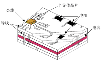 LTCC工藝流程見圖2。圖3為典型的LTCC基板示意圖,由此可知,采用LTCC工藝制作的基板具有可實現IC芯片封裝、內埋置無源元件及高密度電路組裝的功能。