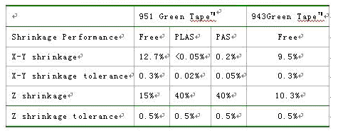 Dupont公司研發的控制收縮燒結技術已應用于60%LTCC基板和30%的LTCC電路產品中。圖5為Dupont公司的控制收縮技術,表4給出相應的性能。