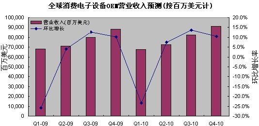 下圖所示為iSuppli公司對(duì)于各季度全球消費(fèi)電子設(shè)備營業(yè)收入的預(yù)測(cè)。