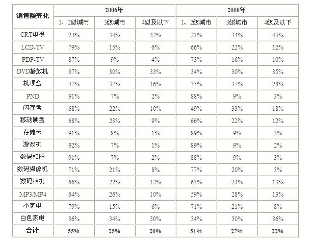 表1 2006年與2008年中國主要消費電子終端產(chǎn)品不同級別城市銷售額結(jié)構(gòu)變化