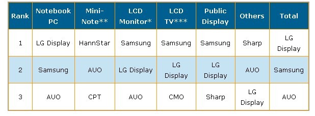 - Samsung奪魁,營收達到42億美元,并占總體TFTLCD出貨營收的27.8%