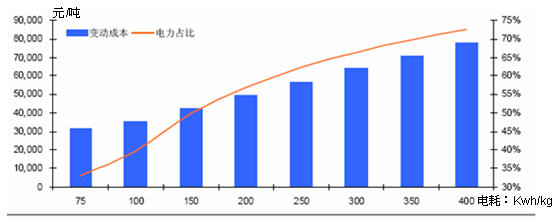 - 國內企業(yè)在綜合電耗高的在300kWh/kg以上,電耗低的則在200kWh/kg左右