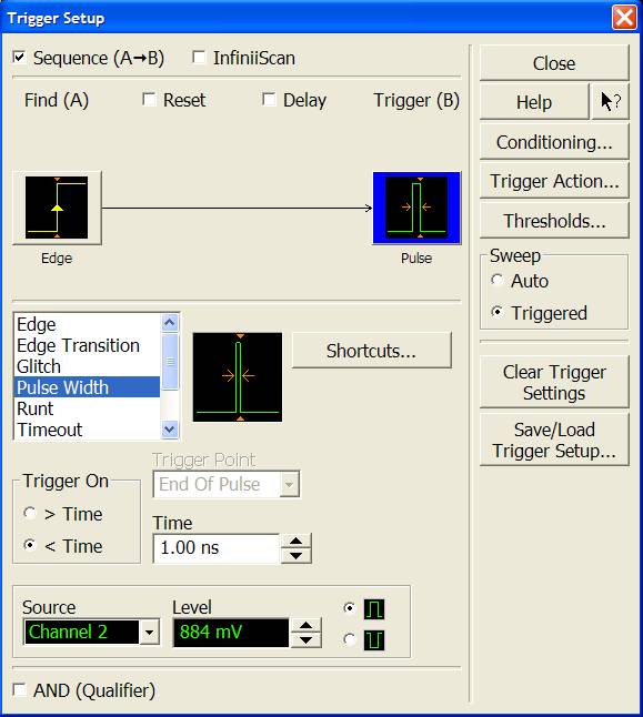 然而,當您回顧上一段的內容時就會發現,當自動觸發發生時,它就意味著每次觸發之后,示波器進行重新準備時具有掛起時間。為了完全避免這一時間,示波器應改為“觸發(triggered)”模式。(這在某些示波器中稱為“正常”模式)。在“觸發(triggered)”模式中,除非發現觸發事件,否則示波器將不會進行觸發。因此,如果用戶將觸發模式設置為毛刺信號并且示波器一直沒有進行觸發,那么用戶就可以確信毛刺信號沒有發生(至少示波器能夠檢測出)。