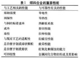 微電子領(lǐng)域使用的焊料有著很嚴格的性能要求,無鉛焊料也不例外,不僅包括電學(xué)和力學(xué)性能,還必須具有理想的熔融溫度。從制造工藝和可靠性兩方面考慮,表1列出了焊料合金的一些重要性能。