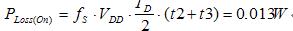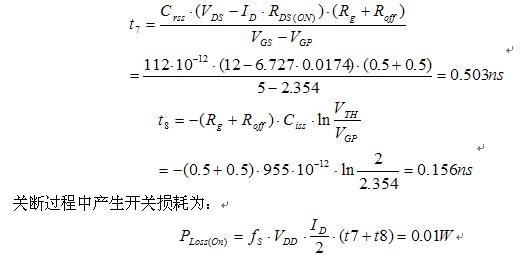 MOSFET開通損耗主要發(fā)生t2和t3時間段。下面以一個具體的實例下計算。輸入電壓12V,輸出電壓3.3V/6A,開關(guān)頻率350kHz,PWM柵極驅(qū)動器電壓為5V,導(dǎo)通電阻1.5Ohm,關(guān)斷的下拉電阻為0.5Ohm,所用的MOSFET為AO4468,具體參數(shù)如下:Ciss= 955pF,Coss= 145pF,Crss= 112pF,Rg= 0.5Ohm;當VGS= 4.5V,Qg= 9nC;當VGS=10V,Qg= 17nC,Qgd= 4.7nC,Qgs= 3.4nC;當VGS=5V且ID=11.6A,跨導(dǎo)gFS= 19S;當VDS=VGS且ID=250uA,,VTH= 2V;當VGS= 4.5V且ID=10A,RDS(ON)=17.4mOhm。