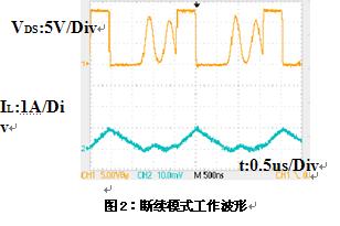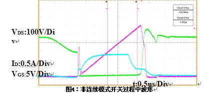 注意到圖1是基于連續(xù)電流模式下所得到的波形,對于非連續(xù)模式,由于開通前的電流為0,所以,除了Coss放電產(chǎn)生的功耗外,沒有開關(guān)的損耗,即非連續(xù)模式下開通損耗為0。但在實際的檢測中,非連續(xù)模式下仍然可以看到VGS有米勒平臺,這主要是由于Coss的放電電流產(chǎn)生的。Coss放電快,持續(xù)的時間短,這樣電流迅速降低,由于VGS和ID的受轉(zhuǎn)移特性的約束,所以當電流突然降低時,VGS也會降低,VGS波形前沿的米勒平臺處產(chǎn)生一個下降的凹坑,并伴隨著振蕩。