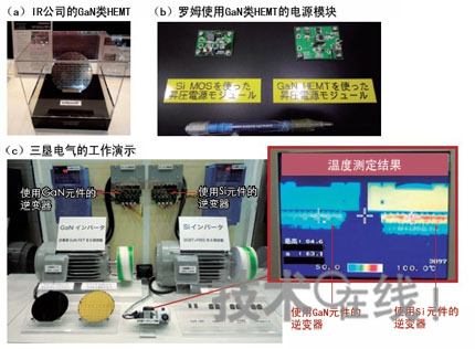 為了降低成本,使用Si底板的展出接連不斷。IR展出了形成有GaN類HEMT的晶圓(a)。羅姆也首次試制使用Si底板的GaN類HEMT并展出了電源模塊(b)。三墾電氣使用配備有6個SBD內置GaN類FET的逆變器驅動200V、2.2kW的3相交流馬達,與利用配備Si制IGBT和FRD的逆變器進行驅動時逆變器表面溫度的變化進行了比較(c)。左側配備GaN元件的逆變器損失小且溫度低。