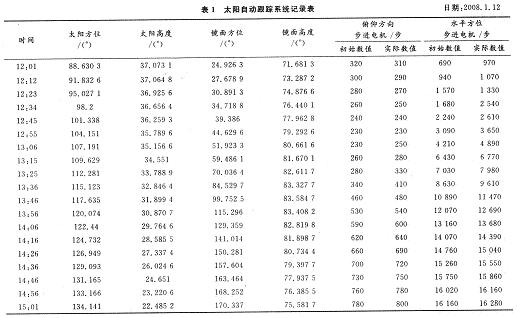 表1中列出了2009年1月12日中午至下午三時左右的理論數(shù)據(jù),并用系統(tǒng)的手動校準功能,記錄下不同時刻的步進電機實際運行步數(shù)。